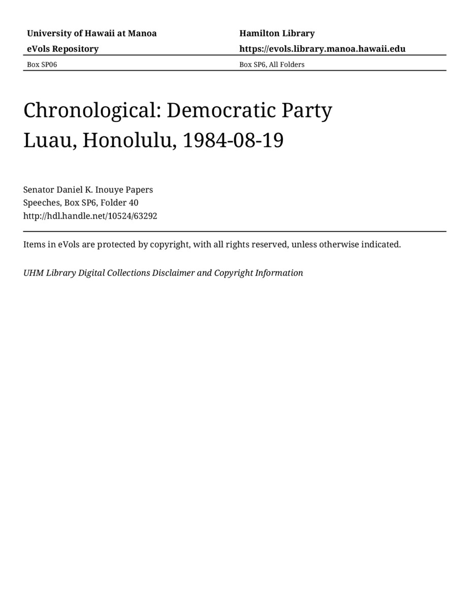 Democratic Party Luau, Honolulu, August 19, 1984, MANUSCRIPT-HCPC00011, Speeches, Chronological, Box SP6, Folder 40, Senator Daniel K. Inouye Papers, Hawaiʻi Congressional Papers Collection, University of Hawaiʻi at Mānoa Library, Honolulu, HI. https://congressarchives.org/catalog/10524_63292 (accessed March 21, 2026).