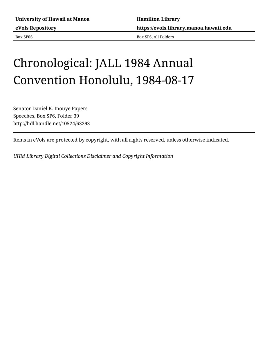 JACL 1984 Annual Convention Honolulu, August 17, 1984, MANUSCRIPT-HCPC00011, Speeches, Chronological, Box SP6, Folder 39, Senator Daniel K. Inouye Papers, Hawaiʻi Congressional Papers Collection, University of Hawaiʻi at Mānoa Library, Honolulu, HI. https://congressarchives.org/catalog/10524_63293 (accessed March 21, 2026).