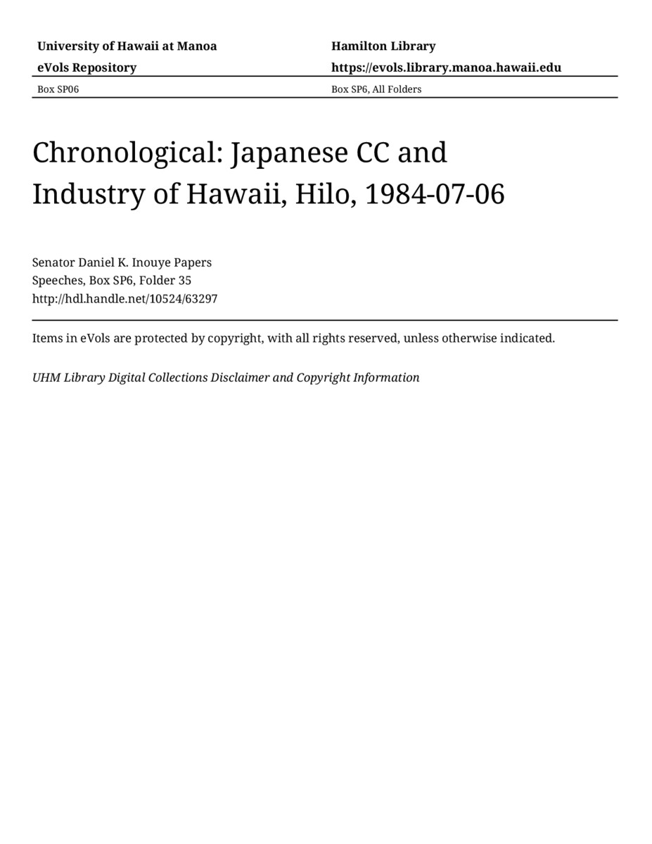 Japanese CC and Industry of Hawaii, Hilo, July 6, 1984, MANUSCRIPT-HCPC00011, Speeches, Chronological, Box SP6, Folder 35, Senator Daniel K. Inouye Papers, Hawaiʻi Congressional Papers Collection, University of Hawaiʻi at Mānoa Library, Honolulu, HI. https://congressarchives.org/catalog/10524_63297 (accessed March 19, 2026).