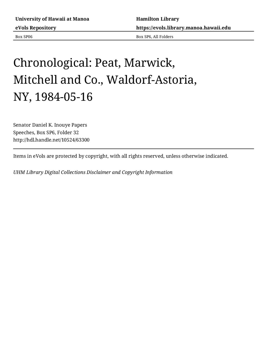 Peat, Marwick, Mitchell and Co., Waldorf-Astoria, NY, May 16, 1984, MANUSCRIPT-HCPC00011, Speeches, Chronological, Box SP6, Folder 32, Senator Daniel K. Inouye Papers, Hawaiʻi Congressional Papers Collection, University of Hawaiʻi at Mānoa Library, Honolulu, HI. https://congressarchives.org/catalog/10524_63300 (accessed March 20, 2026).