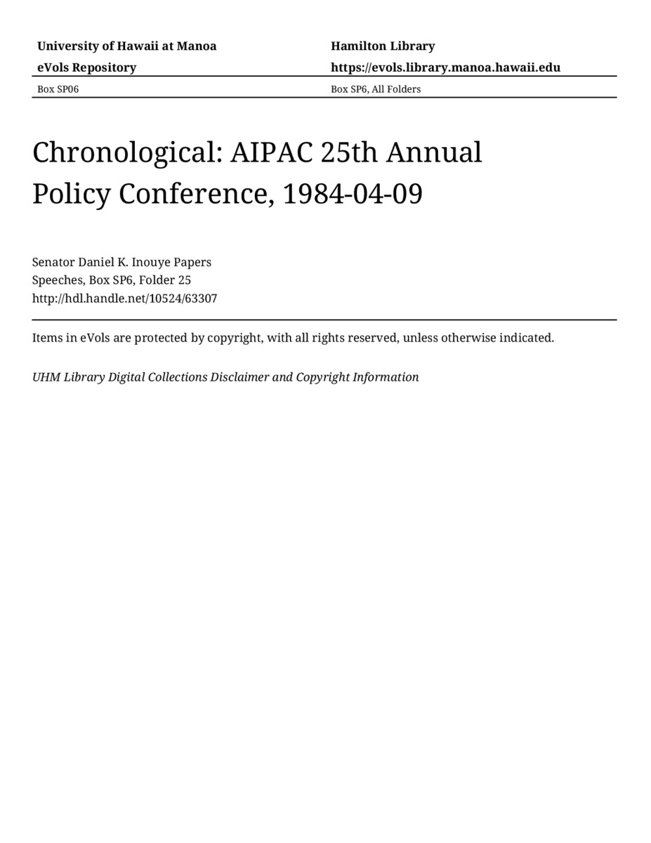 AIPAC 25th Annual Policy Conference, April 9, 1984, MANUSCRIPT-HCPC00011, Speeches, Chronological, Box SP6, Folder 25, Senator Daniel K. Inouye Papers, Hawaiʻi Congressional Papers Collection, University of Hawaiʻi at Mānoa Library, Honolulu, HI. https://congressarchives.org/catalog/10524_63307 (accessed March 21, 2026).