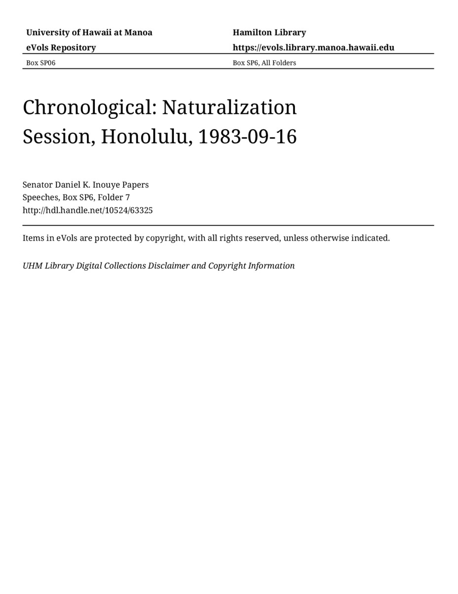 Naturalization Session, Honolulu, September 16, 1983, MANUSCRIPT-HCPC00011, Speeches, Chronological, Box SP6, Folder 7, Senator Daniel K. Inouye Papers, Hawaiʻi Congressional Papers Collection, University of Hawaiʻi at Mānoa Library, Honolulu, HI. https://congressarchives.org/catalog/10524_63325 (accessed March 20, 2026).