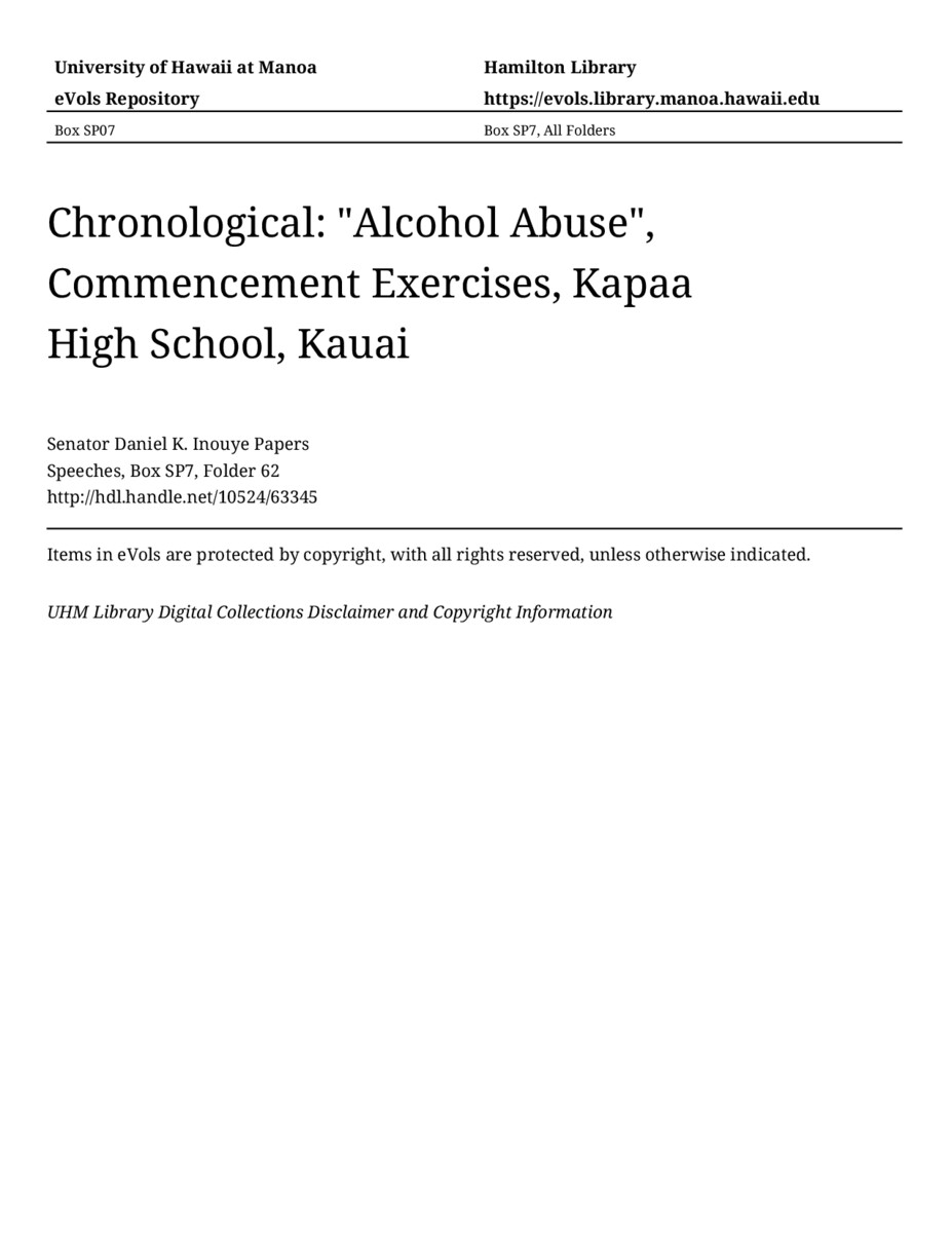 - "Alcohol Abuse", Commencement Exercises, Kapaa High School, Kauai
