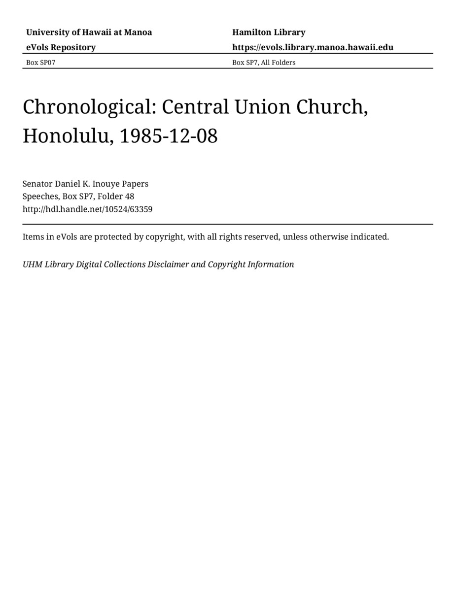 Central Union Church, Honolulu, December 8, 1985, MANUSCRIPT-HCPC00011, Speeches, Chronological, Box SP7, Folder 48, Senator Daniel K. Inouye Papers, Hawaiʻi Congressional Papers Collection, University of Hawaiʻi at Mānoa Library, Honolulu, HI. https://congressarchives.org/catalog/10524_63359 (accessed March 23, 2026).