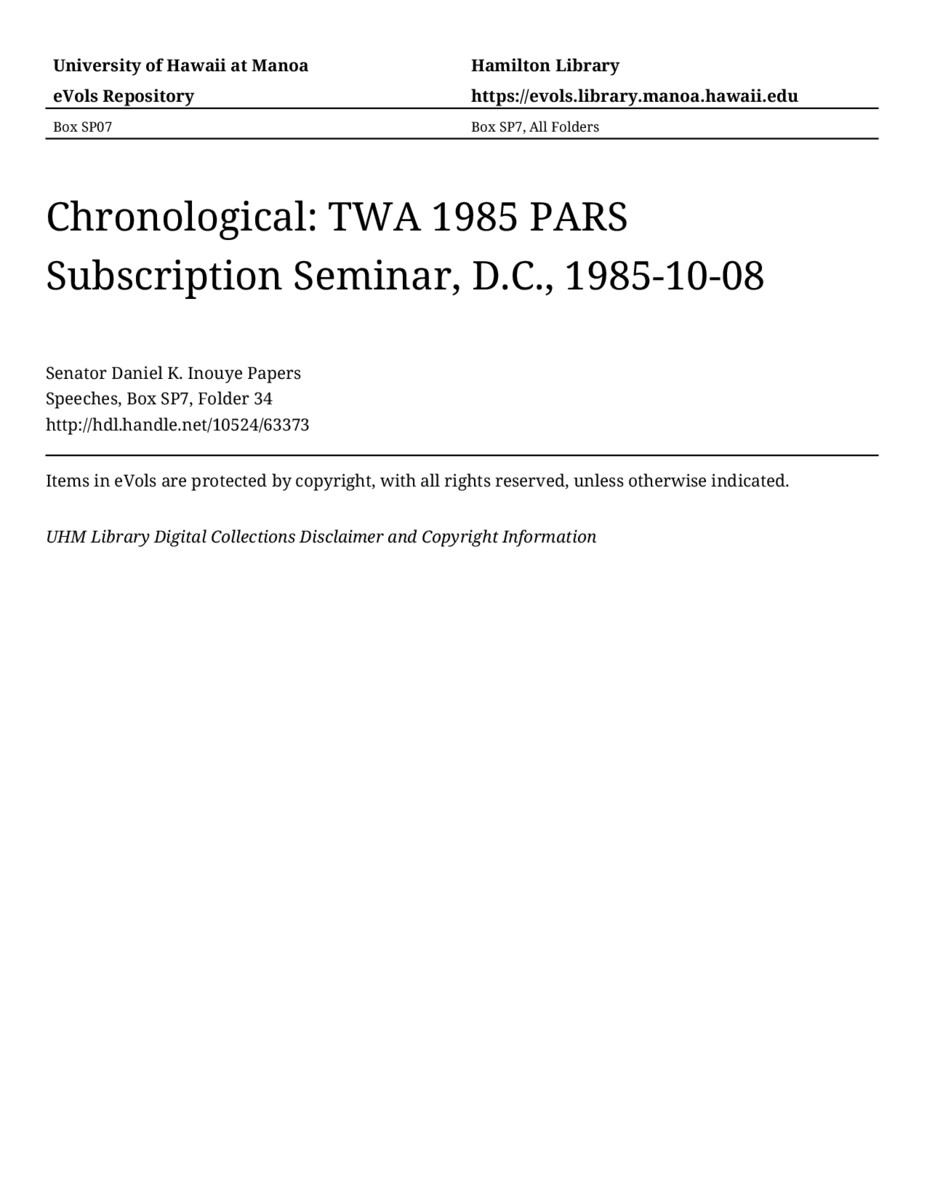 TWA 1985 PARS Subscription Seminar, D.C., October 8, 1985, MANUSCRIPT-HCPC00011, Speeches, Chronological, Box SP7, Folder 34, Senator Daniel K. Inouye Papers, Hawaiʻi Congressional Papers Collection, University of Hawaiʻi at Mānoa Library, Honolulu, HI. https://congressarchives.org/catalog/10524_63373 (accessed March 22, 2026).