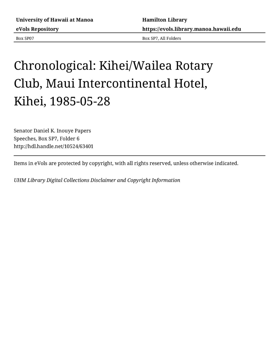 Kihei/Wailea Rotary Club, Maui Intercontinental Hotel, Kihei, May 28, 1985, MANUSCRIPT-HCPC00011, Speeches, Chronological, Box SP7, Folder 6, Senator Daniel K. Inouye Papers, Hawaiʻi Congressional Papers Collection, University of Hawaiʻi at Mānoa Library, Honolulu, HI. https://congressarchives.org/catalog/10524_63401 (accessed March 21, 2026).
