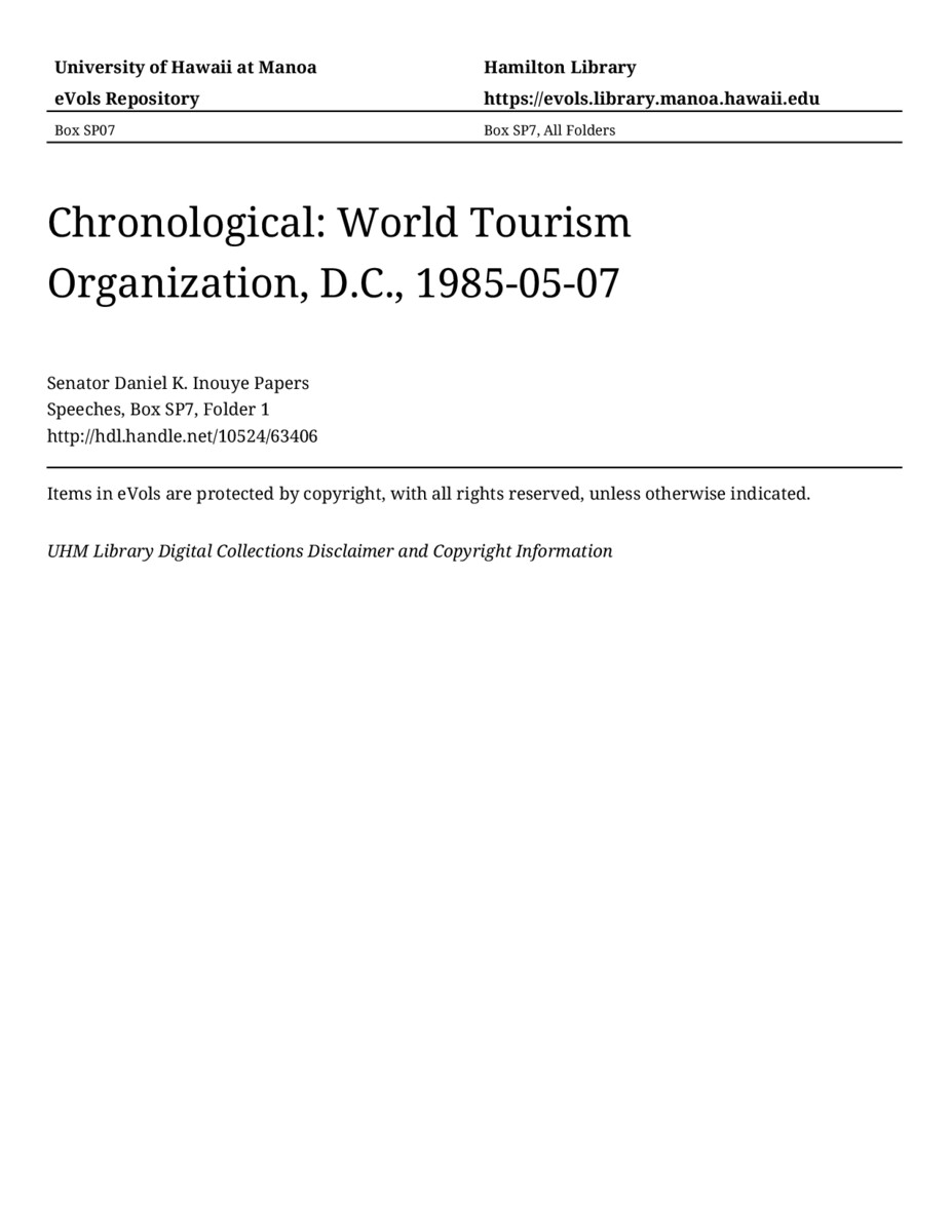 World Tourism Organization, D.C., May 7, 1985, MANUSCRIPT-HCPC00011, Speeches, Chronological, Box SP7, Folder 1, Senator Daniel K. Inouye Papers, Hawaiʻi Congressional Papers Collection, University of Hawaiʻi at Mānoa Library, Honolulu, HI. https://congressarchives.org/catalog/10524_63406 (accessed March 21, 2026).
