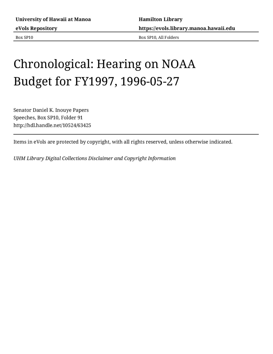 Hearing on NOAA Budget for FY1997, May 27, 1996, MANUSCRIPT-HCPC00011, Speeches, Chronological, Box SP10, Folder 91, Senator Daniel K. Inouye Papers, Hawaiʻi Congressional Papers Collection, University of Hawaiʻi at Mānoa Library, Honolulu, HI. https://congressarchives.org/catalog/10524_63425 (accessed March 18, 2026).