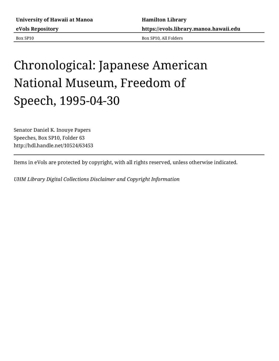 Japanese American National Museum, Freedom of Speech, April 30, 1995, MANUSCRIPT-HCPC00011, Speeches, Chronological, Box SP10, Folder 63, Senator Daniel K. Inouye Papers, Hawaiʻi Congressional Papers Collection, University of Hawaiʻi at Mānoa Library, Honolulu, HI. https://congressarchives.org/catalog/10524_63453 (accessed March 22, 2026).