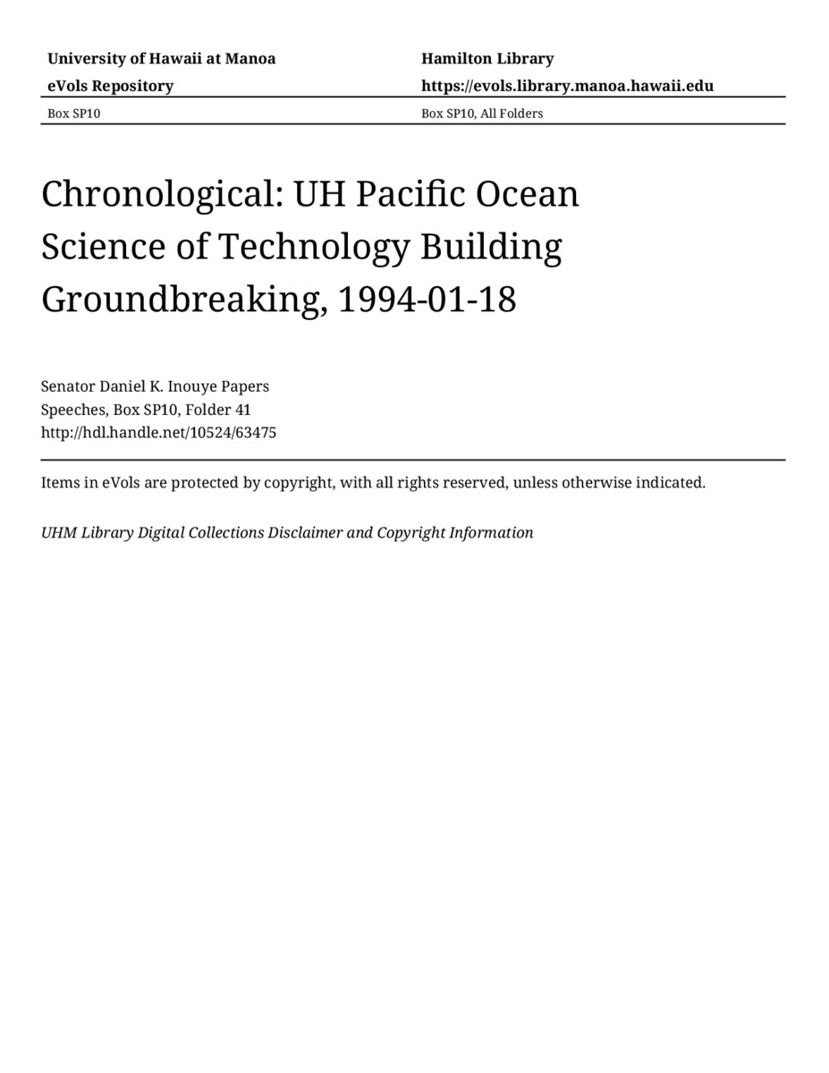 UH Pacific Ocean Science of Technology Building Groundbreaking, January 18, 1994, MANUSCRIPT-HCPC00011, Speeches, Chronological, Box SP10, Folder 41, Senator Daniel K. Inouye Papers, Hawaiʻi Congressional Papers Collection, University of Hawaiʻi at Mānoa Library, Honolulu, HI. https://congressarchives.org/catalog/10524_63475 (accessed March 22, 2026).