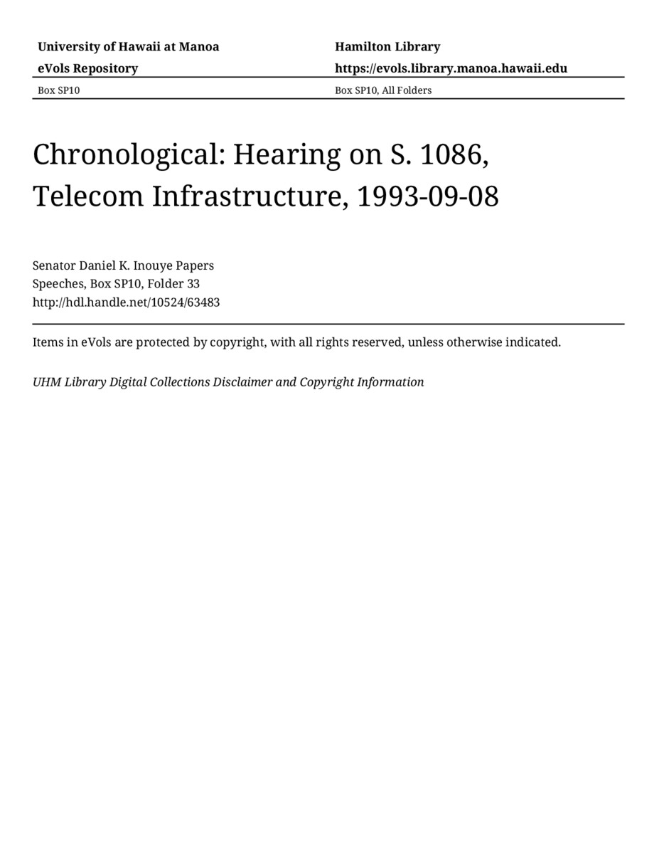Hearing on S. 1086, Telecom Infrastructure, September 8, 1993, MANUSCRIPT-HCPC00011, Speeches, Chronological, Box SP10, Folder 33, Senator Daniel K. Inouye Papers, Hawaiʻi Congressional Papers Collection, University of Hawaiʻi at Mānoa Library, Honolulu, HI. https://congressarchives.org/catalog/10524_63483 (accessed March 20, 2026).