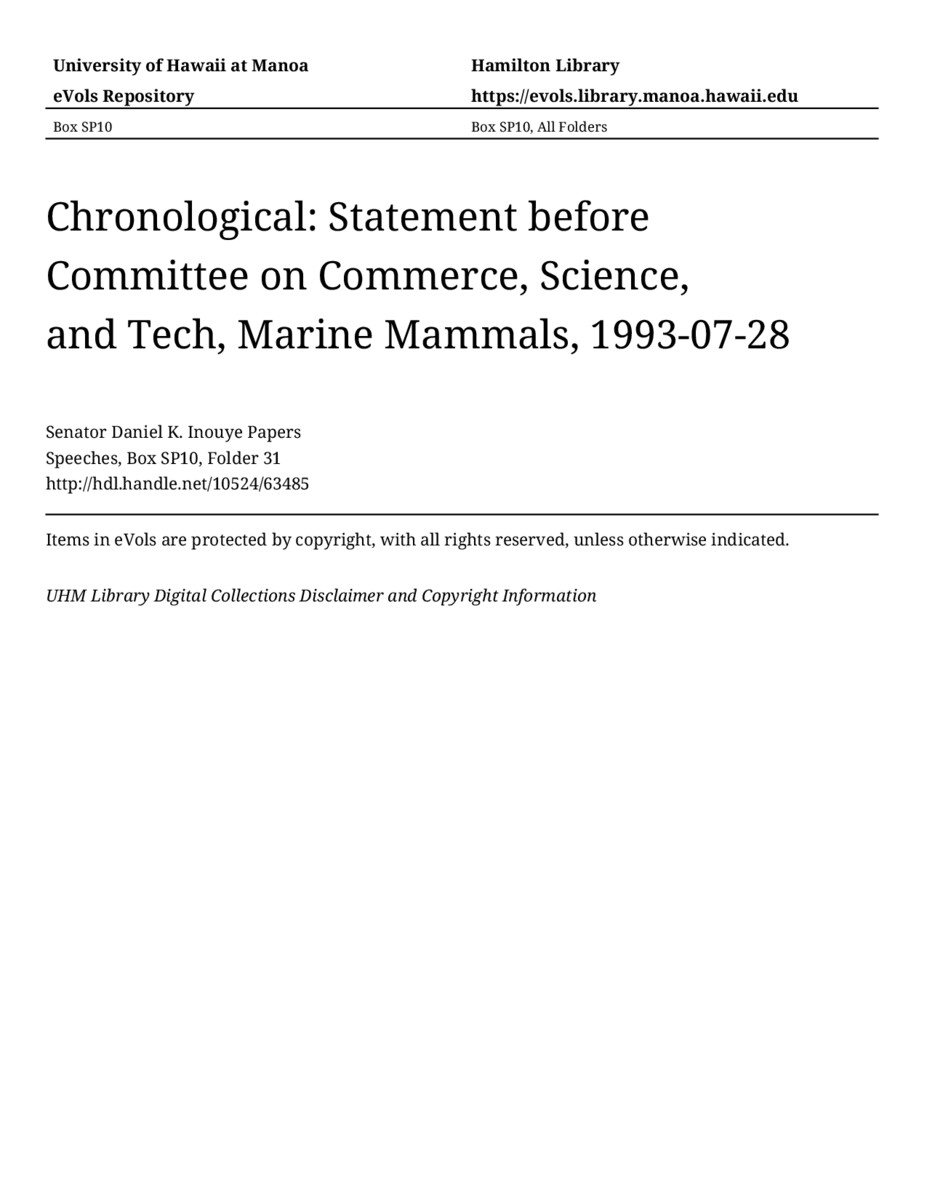 - Statement before Committee on Commerce, Science, and Tech, Marine Mammals