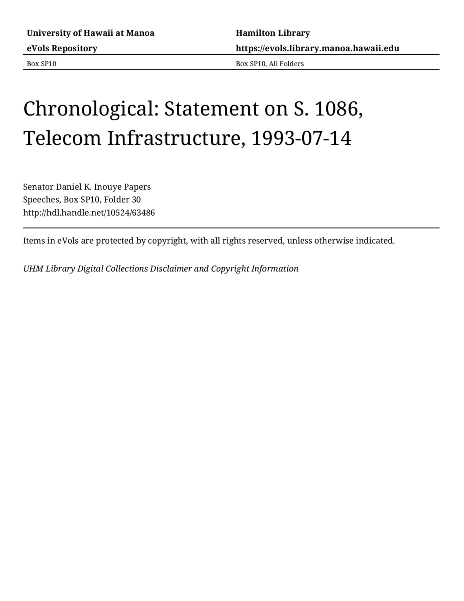 Statement on S. 1086, Telecom Infrastructure, July 14, 1993, MANUSCRIPT-HCPC00011, Speeches, Chronological, Box SP10, Folder 30, Senator Daniel K. Inouye Papers, Hawaiʻi Congressional Papers Collection, University of Hawaiʻi at Mānoa Library, Honolulu, HI. https://congressarchives.org/catalog/10524_63486 (accessed March 20, 2026).