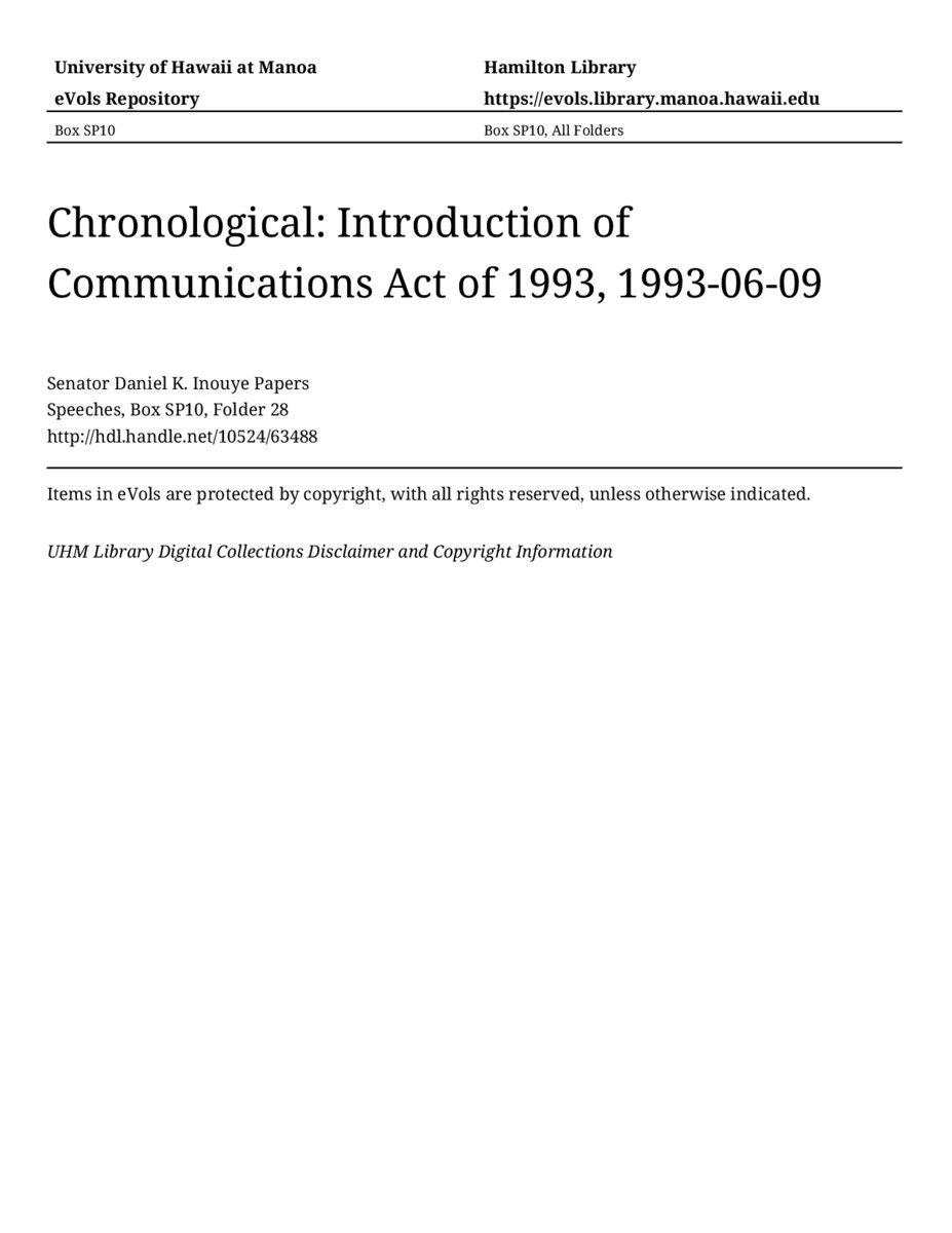Introduction of Communications Act of 1993, June 9, 1993, MANUSCRIPT-HCPC00011, Speeches, Chronological, Box SP10, Folder 28, Senator Daniel K. Inouye Papers, Hawaiʻi Congressional Papers Collection, University of Hawaiʻi at Mānoa Library, Honolulu, HI. https://congressarchives.org/catalog/10524_63488 (accessed March 19, 2026).