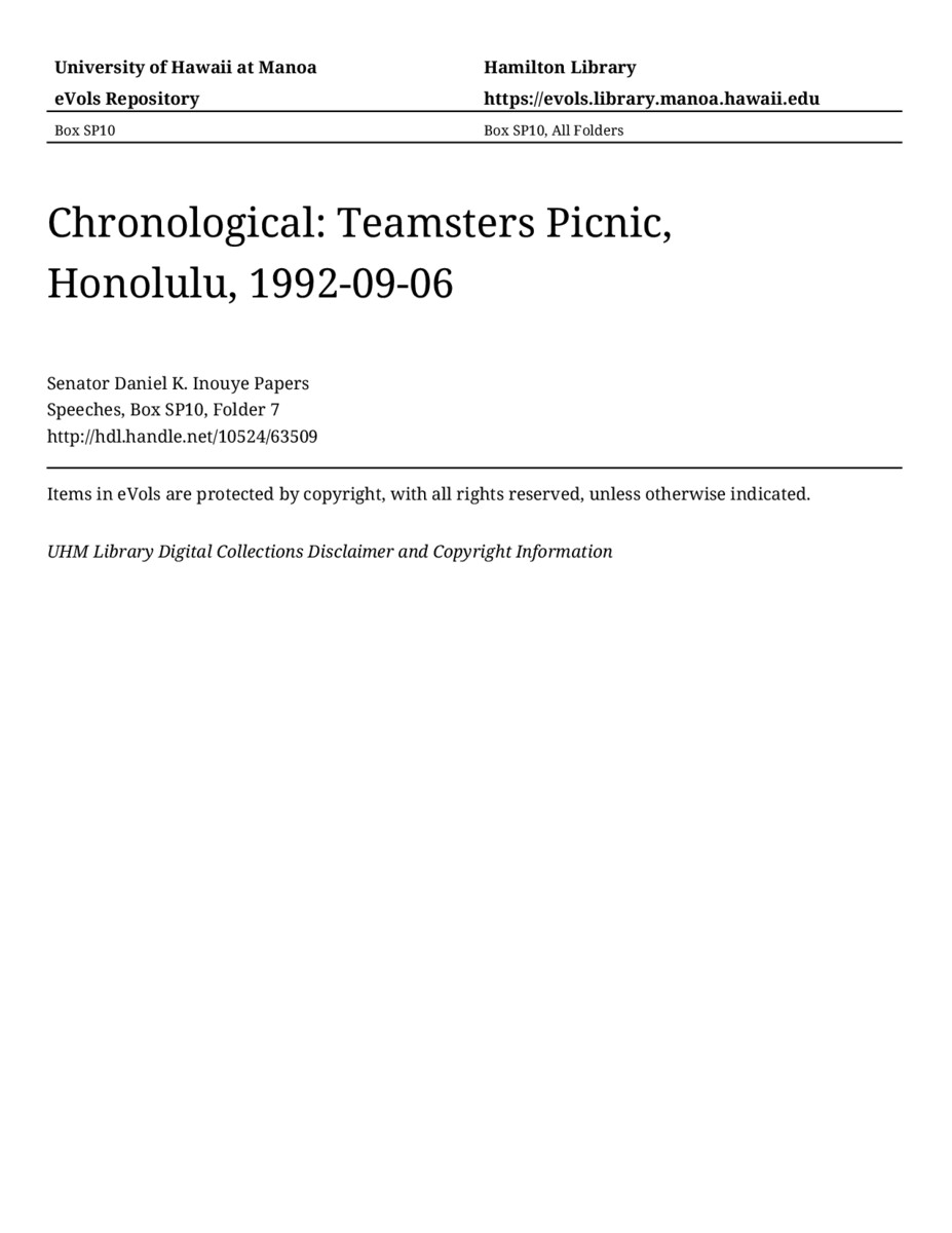 Teamsters Picnic, Honolulu, September 6, 1992, MANUSCRIPT-HCPC00011, Speeches, Chronological, Box SP10, Folder 7, Senator Daniel K. Inouye Papers, Hawaiʻi Congressional Papers Collection, University of Hawaiʻi at Mānoa Library, Honolulu, HI. https://congressarchives.org/catalog/10524_63509 (accessed March 19, 2026).