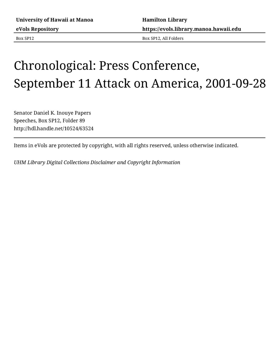 Press Conference, September 11 Attack on America, September 28, 2001, MANUSCRIPT-HCPC00011, Speeches, Chronological, Box SP12, Folder 89, Senator Daniel K. Inouye Papers, Hawaiʻi Congressional Papers Collection, University of Hawaiʻi at Mānoa Library, Honolulu, HI. https://congressarchives.org/catalog/10524_63524 (accessed March 20, 2026).