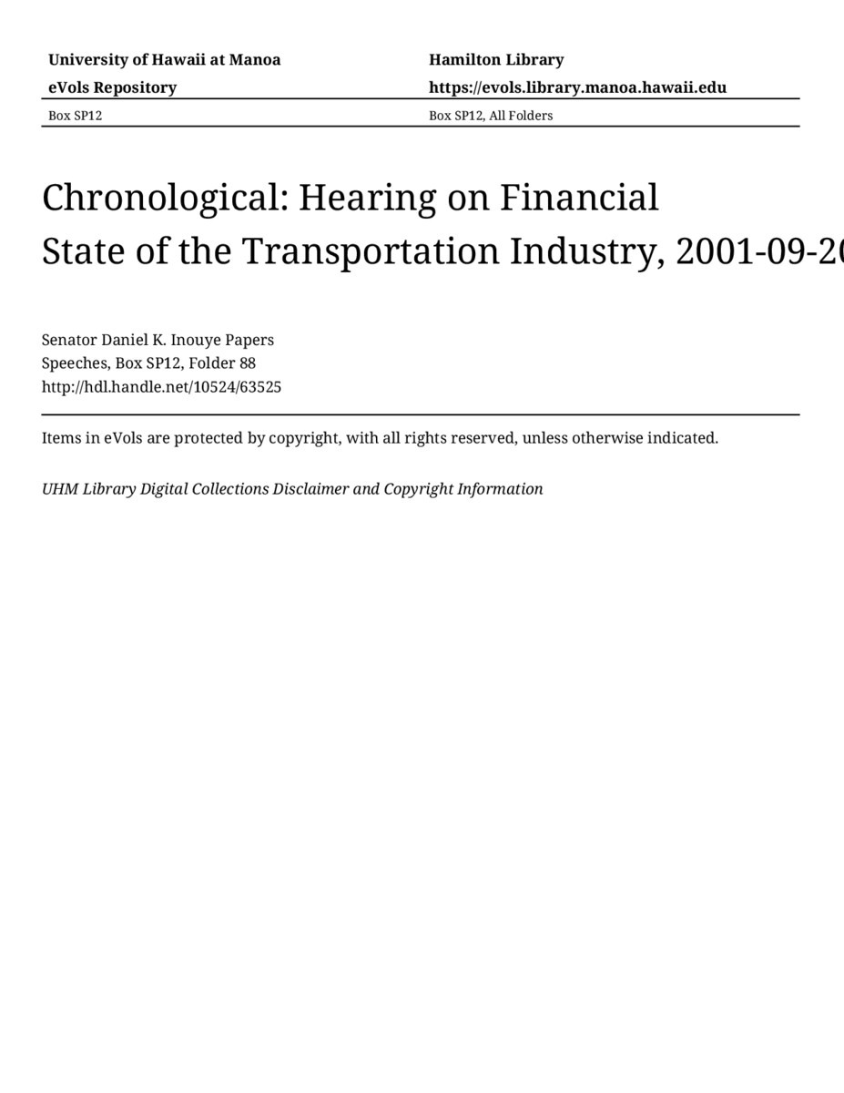 Hearing on Financial State of the Transportation Industry, September 20, 2001, MANUSCRIPT-HCPC00011, Speeches, Chronological, Box SP12, Folder 88, Senator Daniel K. Inouye Papers, Hawaiʻi Congressional Papers Collection, University of Hawaiʻi at Mānoa Library, Honolulu, HI. https://congressarchives.org/catalog/10524_63525 (accessed March 20, 2026).