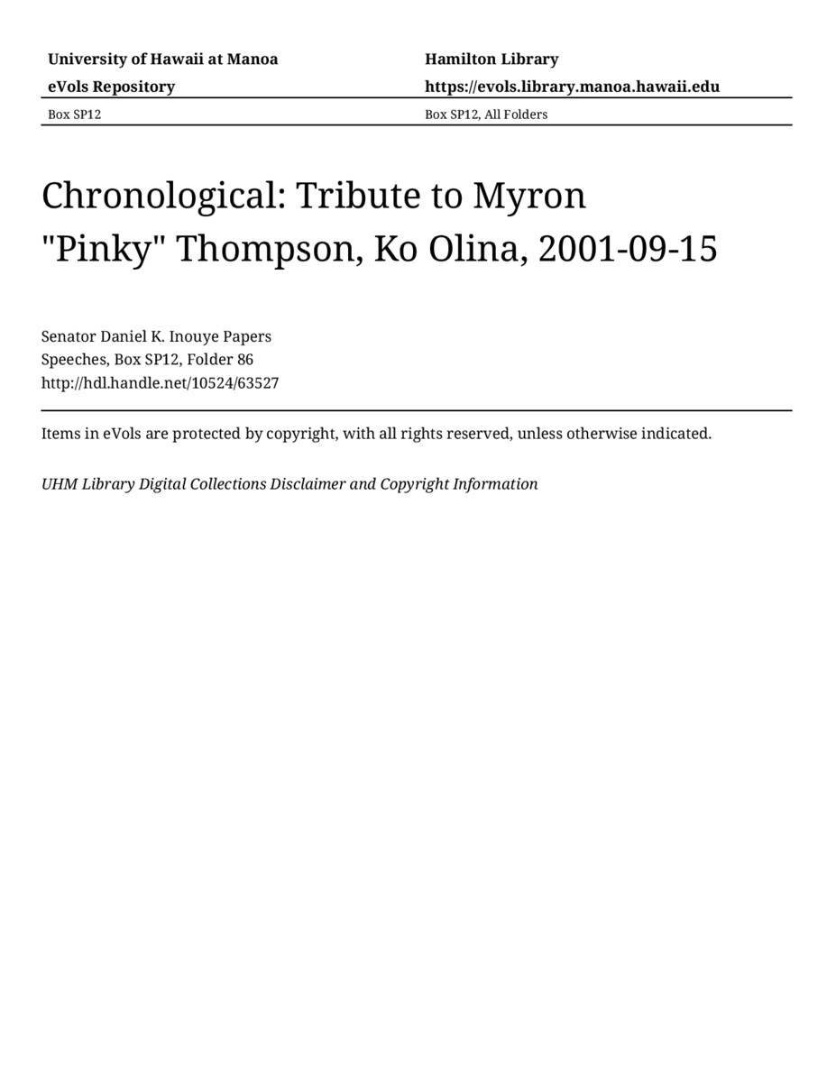 Tribute to Myron "Pinky" Thompson, Ko Olina, September 15, 2001, MANUSCRIPT-HCPC00011, Speeches, Chronological, Box SP12, Folder 86, Senator Daniel K. Inouye Papers, Hawaiʻi Congressional Papers Collection, University of Hawaiʻi at Mānoa Library, Honolulu, HI. https://congressarchives.org/catalog/10524_63527 (accessed March 20, 2026).