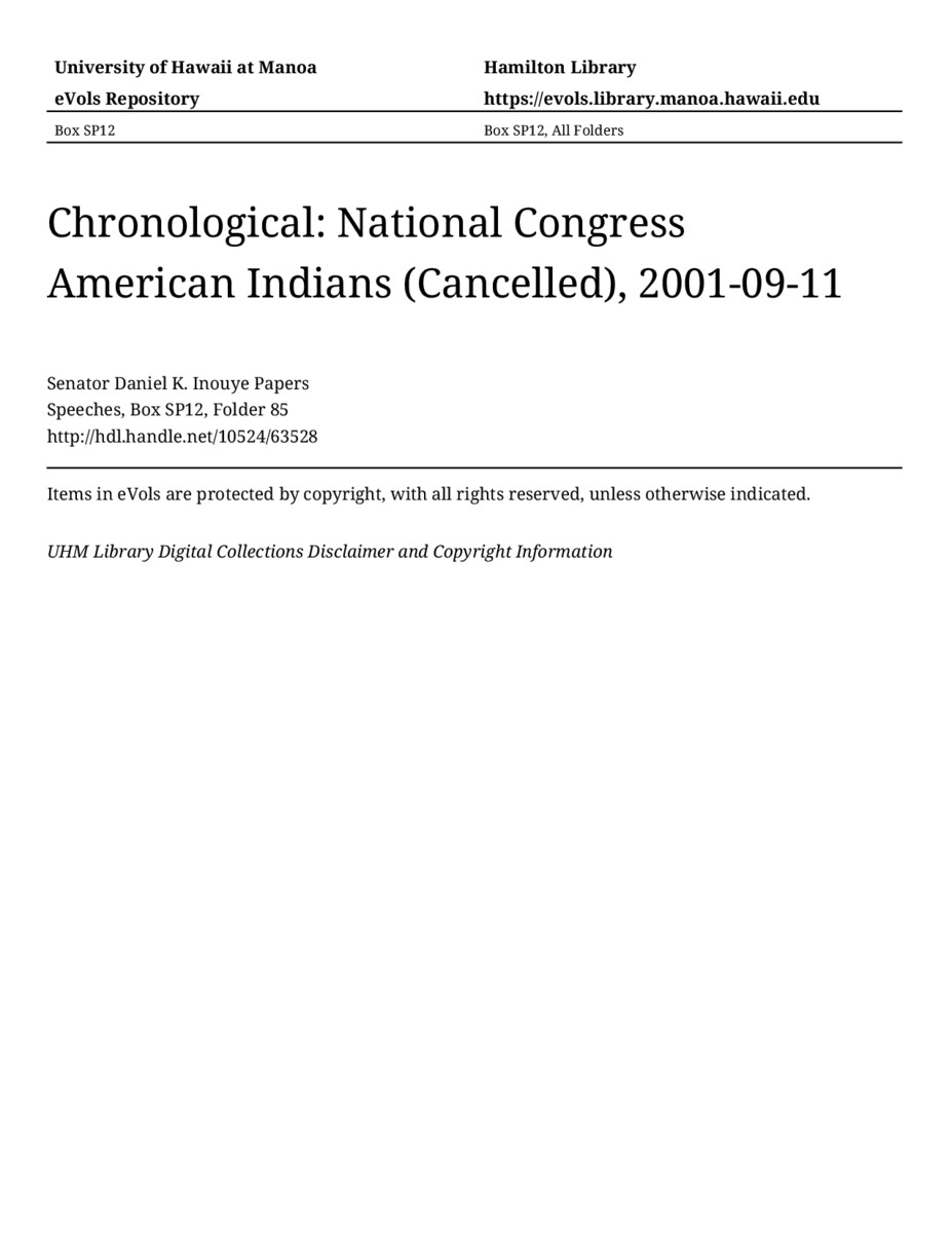 National Congress American Indians (Cancelled), September 11, 2001, MANUSCRIPT-HCPC00011, Speeches, Chronological, Box SP12, Folder 85, Senator Daniel K. Inouye Papers, Hawaiʻi Congressional Papers Collection, University of Hawaiʻi at Mānoa Library, Honolulu, HI. https://congressarchives.org/catalog/10524_63528 (accessed March 20, 2026).