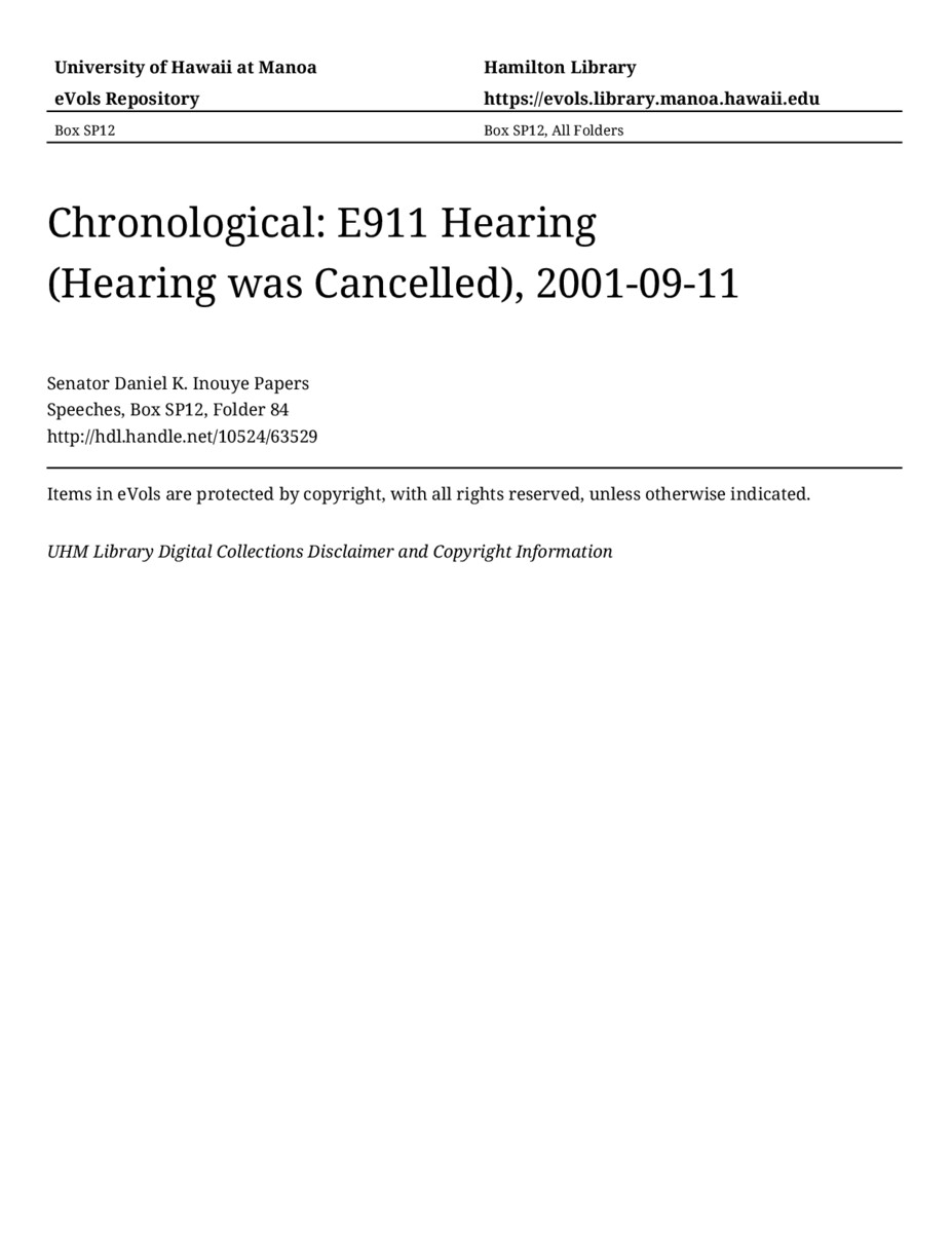 E911 Hearing (Hearing was Cancelled), September 11, 2001, MANUSCRIPT-HCPC00011, Speeches, Chronological, Box SP12, Folder 84, Senator Daniel K. Inouye Papers, Hawaiʻi Congressional Papers Collection, University of Hawaiʻi at Mānoa Library, Honolulu, HI. https://congressarchives.org/catalog/10524_63529 (accessed March 18, 2026).
