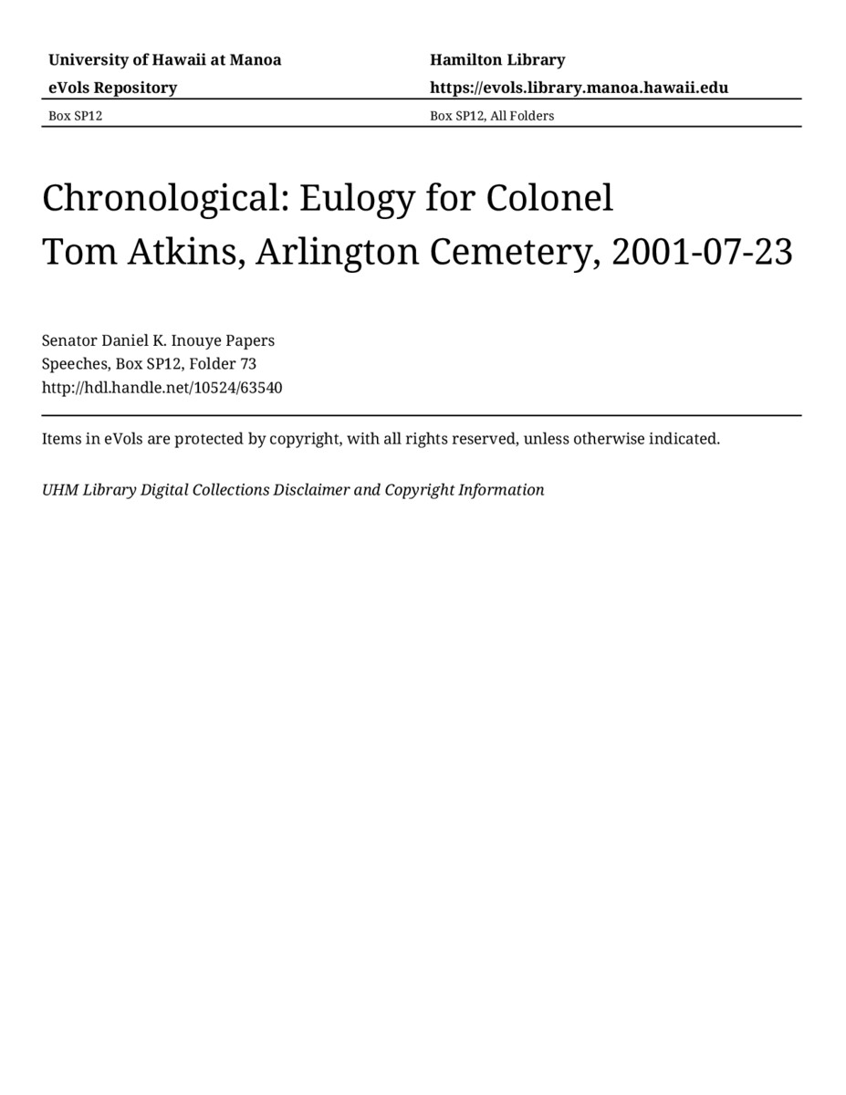 Eulogy for Colonel Tom Atkins, Arlington Cemetery, July 23, 2001, MANUSCRIPT-HCPC00011, Speeches, Chronological, Box SP12, Folder 73, Senator Daniel K. Inouye Papers, Hawaiʻi Congressional Papers Collection, University of Hawaiʻi at Mānoa Library, Honolulu, HI. https://congressarchives.org/catalog/10524_63540 (accessed March 21, 2026).