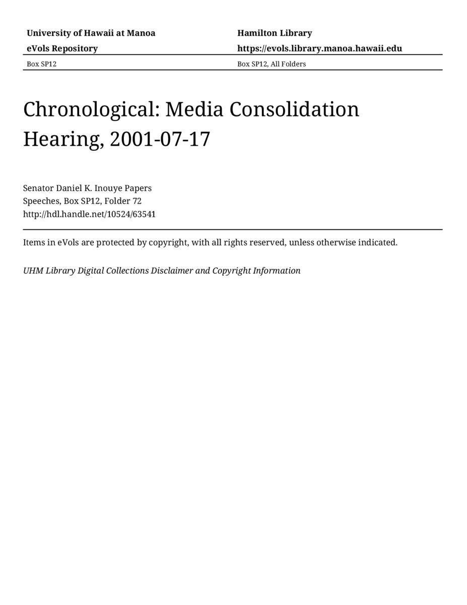 Media Consolidation Hearing, July 17, 2001, MANUSCRIPT-HCPC00011, Speeches, Chronological, Box SP12, Folder 72, Senator Daniel K. Inouye Papers, Hawaiʻi Congressional Papers Collection, University of Hawaiʻi at Mānoa Library, Honolulu, HI. https://congressarchives.org/catalog/10524_63541 (accessed March 19, 2026).