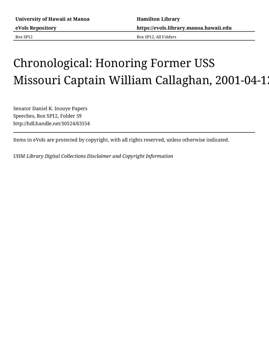 Honoring Former USS Missouri Captain William Callaghan, April 12, 2001, MANUSCRIPT-HCPC00011, Speeches, Chronological, Box SP12, Folder 59, Senator Daniel K. Inouye Papers, Hawaiʻi Congressional Papers Collection, University of Hawaiʻi at Mānoa Library, Honolulu, HI. https://congressarchives.org/catalog/10524_63554 (accessed March 20, 2026).