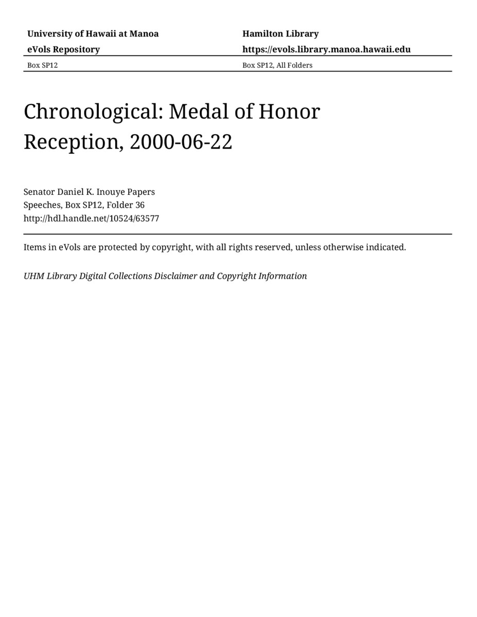 Medal of Honor Reception, June 22, 2000, MANUSCRIPT-HCPC00011, Speeches, Chronological, Box SP12, Folder 36, Senator Daniel K. Inouye Papers, Hawaiʻi Congressional Papers Collection, University of Hawaiʻi at Mānoa Library, Honolulu, HI. https://congressarchives.org/catalog/10524_63577 (accessed March 22, 2026).