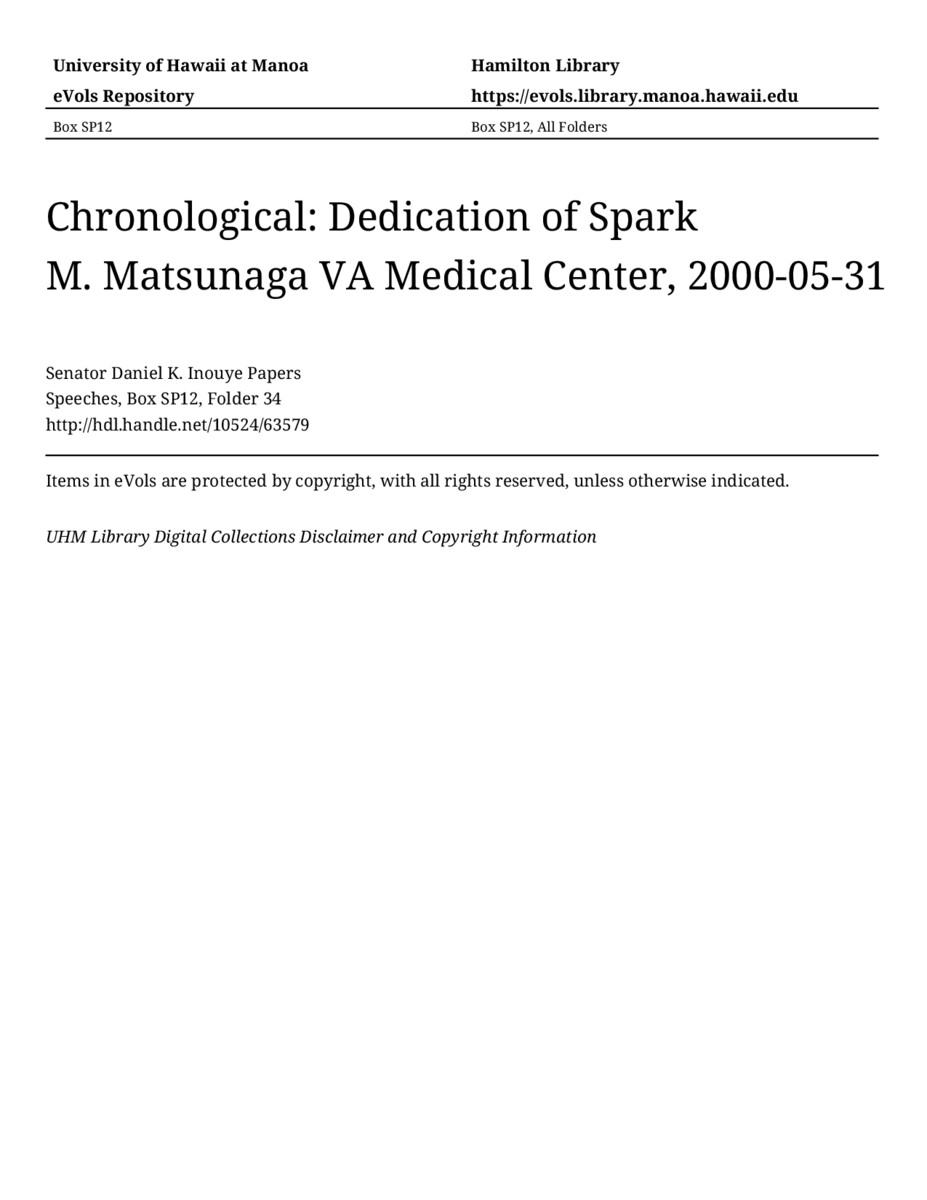Dedication of Spark M. Matsunaga VA Medical Center, May 31, 2000, MANUSCRIPT-HCPC00011, Speeches, Chronological, Box SP12, Folder 34, Senator Daniel K. Inouye Papers, Hawaiʻi Congressional Papers Collection, University of Hawaiʻi at Mānoa Library, Honolulu, HI. https://congressarchives.org/catalog/10524_63579 (accessed March 22, 2026).