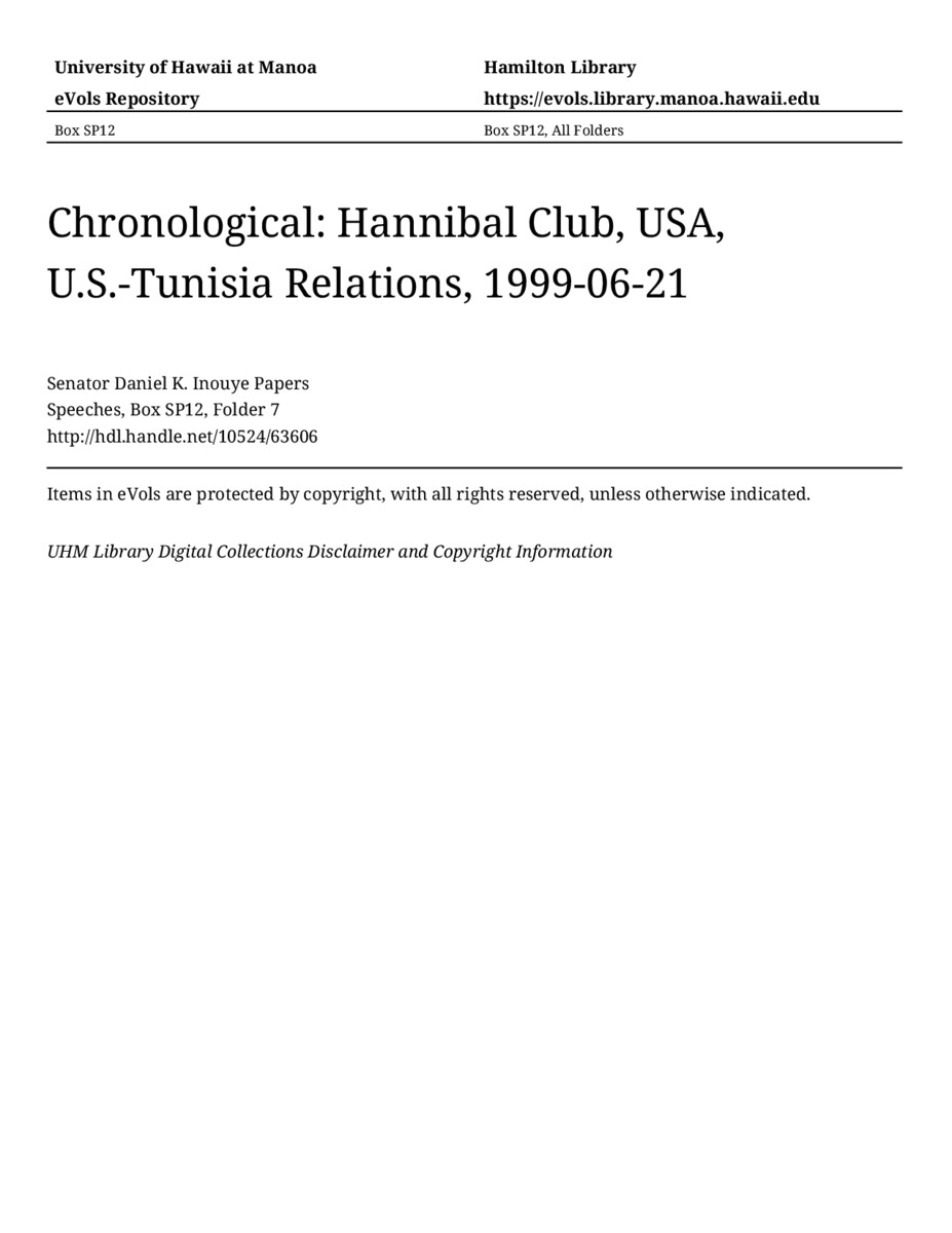 Hannibal Club, USA, U.S.-Tunisia Relations, June 21, 1999, MANUSCRIPT-HCPC00011, Speeches, Chronological, Box SP12, Folder 7, Senator Daniel K. Inouye Papers, Hawaiʻi Congressional Papers Collection, University of Hawaiʻi at Mānoa Library, Honolulu, HI. https://congressarchives.org/catalog/10524_63606 (accessed March 21, 2026).