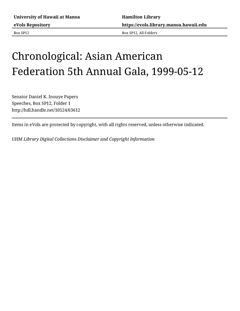 Asian American Federation 5th Annual Gala, May 12, 1999, MANUSCRIPT-HCPC00011, Speeches, Chronological, Box SP12, Folder 1, Senator Daniel K. Inouye Papers, Hawaiʻi Congressional Papers Collection, University of Hawaiʻi at Mānoa Library, Honolulu, HI. https://congressarchives.org/catalog/10524_63612 (accessed March 21, 2026).