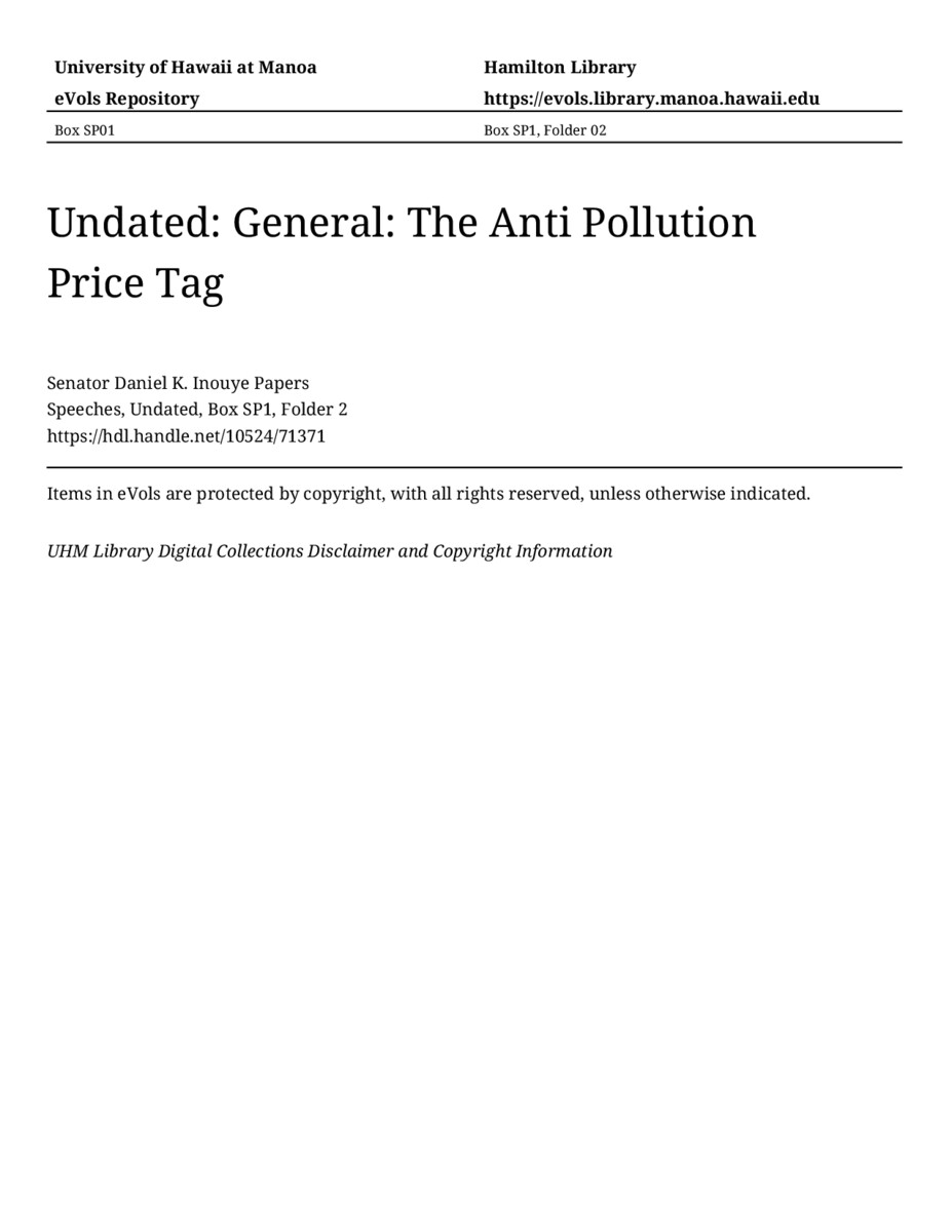The Anti Pollution Price Tag, approximately 1970s, MANUSCRIPT-HCPC00011, Speeches, Undated, Box SP1, Folder 2, Senator Daniel K. Inouye Papers, Hawaiʻi Congressional Papers Collection, University of Hawaiʻi at Mānoa Library, Honolulu, HI. https://congressarchives.org/catalog/10524_71371 (accessed March 20, 2026).