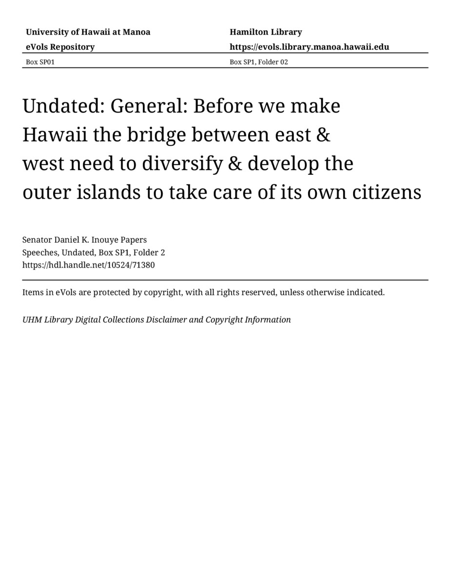 - Before we make Hawaii the bridge between east & west need to diversify & develop the outer islands to take care of its own citizens