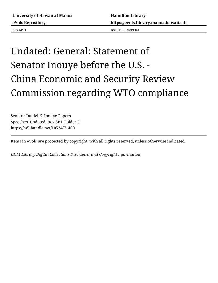 Statement of Senator Inouye before the U.S. - China Economic and Security Review Commission regarding WTO compliance, approximately 2005-2006, MANUSCRIPT-HCPC00011, Speeches, Undated, Box SP1, Folder 3, Senator Daniel K. Inouye Papers, Hawaiʻi Congressional Papers Collection, University of Hawaiʻi at Mānoa Library, Honolulu, HI. https://congressarchives.org/catalog/10524_71400 (accessed March 19, 2026).