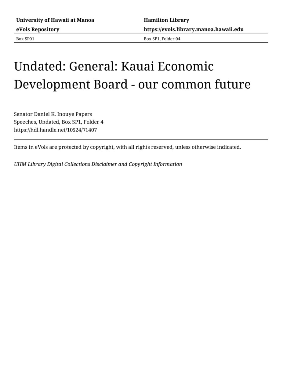 Kauai Economic Development Board - our common future, Undated, MANUSCRIPT-HCPC00011, Speeches, Undated, Box SP1, Folder 4, Senator Daniel K. Inouye Papers, Hawaiʻi Congressional Papers Collection, University of Hawaiʻi at Mānoa Library, Honolulu, HI. https://congressarchives.org/catalog/10524_71407 (accessed March 16, 2026).