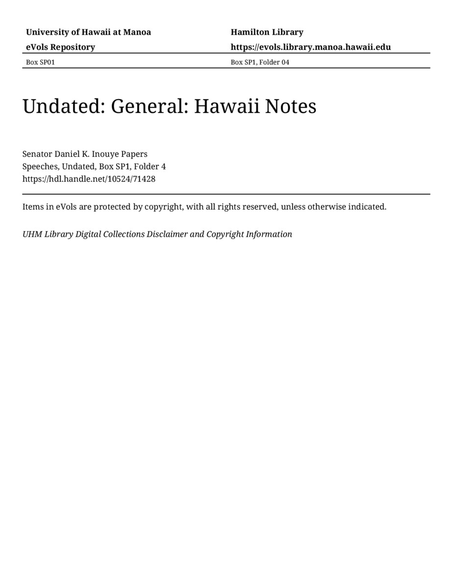 Hawaii Notes, Undated, MANUSCRIPT-HCPC00011, Speeches, Undated, Box SP1, Folder 4, Senator Daniel K. Inouye Papers, Hawaiʻi Congressional Papers Collection, University of Hawaiʻi at Mānoa Library, Honolulu, HI. https://congressarchives.org/catalog/10524_71428 (accessed March 16, 2026).