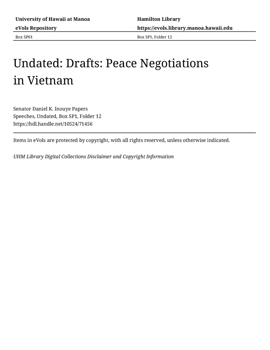 Peace Negotiations in Vietnam, 1967, MANUSCRIPT-HCPC00011, Speeches, Undated, Box SP1, Folder 12, Senator Daniel K. Inouye Papers, Hawaiʻi Congressional Papers Collection, University of Hawaiʻi at Mānoa Library, Honolulu, HI. https://congressarchives.org/catalog/10524_71456 (accessed March 20, 2026).