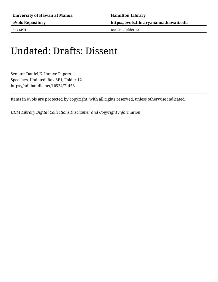 Dissent, 1967, MANUSCRIPT-HCPC00011, Speeches, Undated, Box SP1, Folder 12, Senator Daniel K. Inouye Papers, Hawaiʻi Congressional Papers Collection, University of Hawaiʻi at Mānoa Library, Honolulu, HI. https://congressarchives.org/catalog/10524_71458 (accessed March 19, 2026).