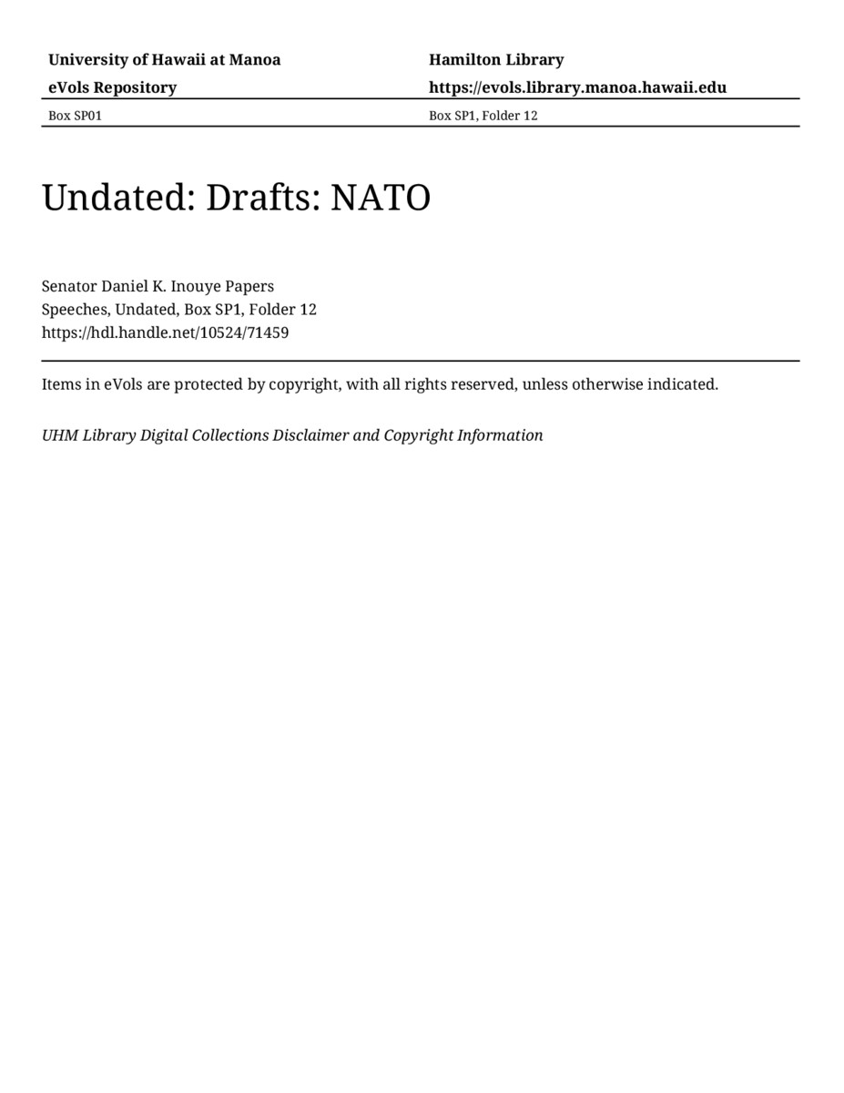 NATO, 1967, MANUSCRIPT-HCPC00011, Speeches, Undated, Box SP1, Folder 12, Senator Daniel K. Inouye Papers, Hawaiʻi Congressional Papers Collection, University of Hawaiʻi at Mānoa Library, Honolulu, HI. https://congressarchives.org/catalog/10524_71459 (accessed March 20, 2026).