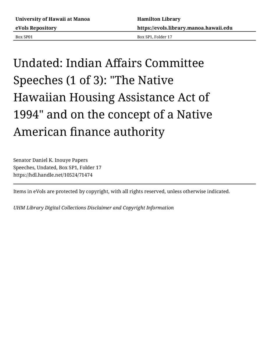 - "The Native Hawaiian Housing Assistance Act of 1994" and on the concept of a Native American finance authority