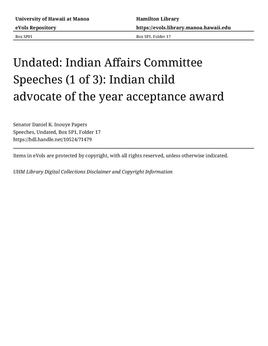 Indian child advocate of the year acceptance award, June 15, 1994, MANUSCRIPT-HCPC00011, Speeches, Undated, Box SP1, Folder 17, Senator Daniel K. Inouye Papers, Hawaiʻi Congressional Papers Collection, University of Hawaiʻi at Mānoa Library, Honolulu, HI. https://congressarchives.org/catalog/10524_71479 (accessed March 20, 2026).