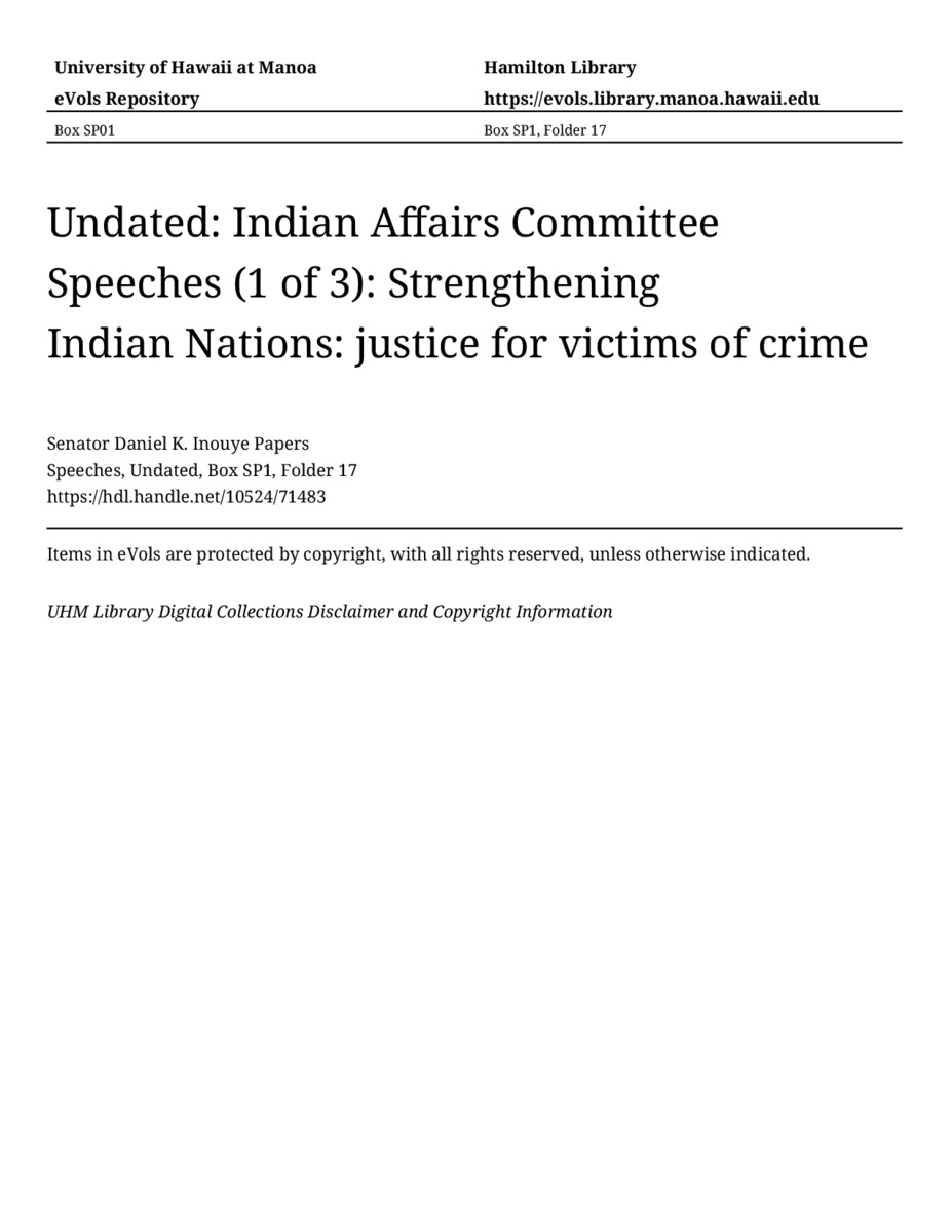 Strengthening Indian Nations: justice for victims of crime, May 11, 1994, MANUSCRIPT-HCPC00011, Speeches, Undated, Box SP1, Folder 17, Senator Daniel K. Inouye Papers, Hawaiʻi Congressional Papers Collection, University of Hawaiʻi at Mānoa Library, Honolulu, HI. https://congressarchives.org/catalog/10524_71483 (accessed March 20, 2026).