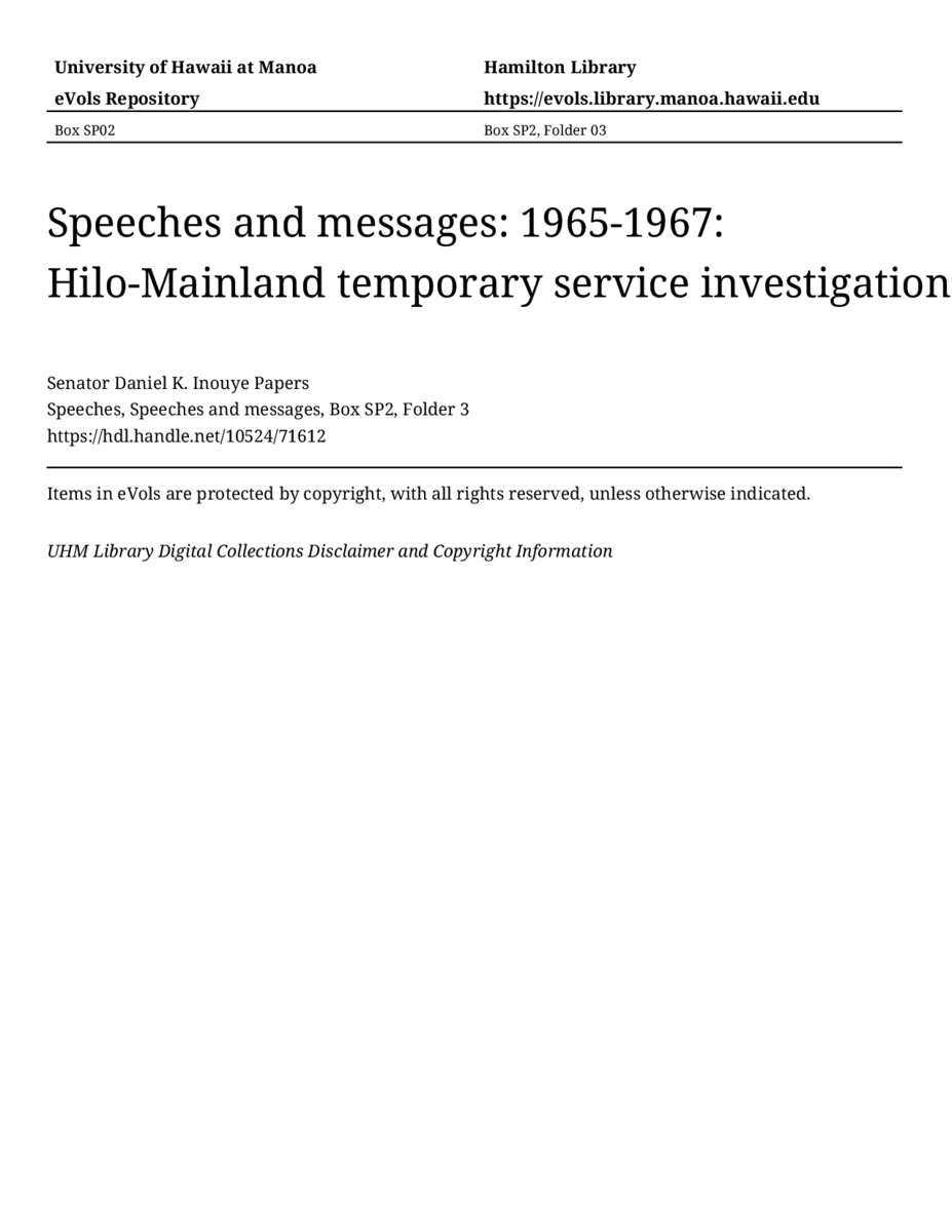Hilo-Mainland temporary service investigation, January 27, 1967, MANUSCRIPT-HCPC00011, Speeches, Speeches and messages, Box SP2, Folder 3, Senator Daniel K. Inouye Papers, Hawaiʻi Congressional Papers Collection, University of Hawaiʻi at Mānoa Library, Honolulu, HI. https://congressarchives.org/catalog/10524_71612 (accessed March 20, 2026).