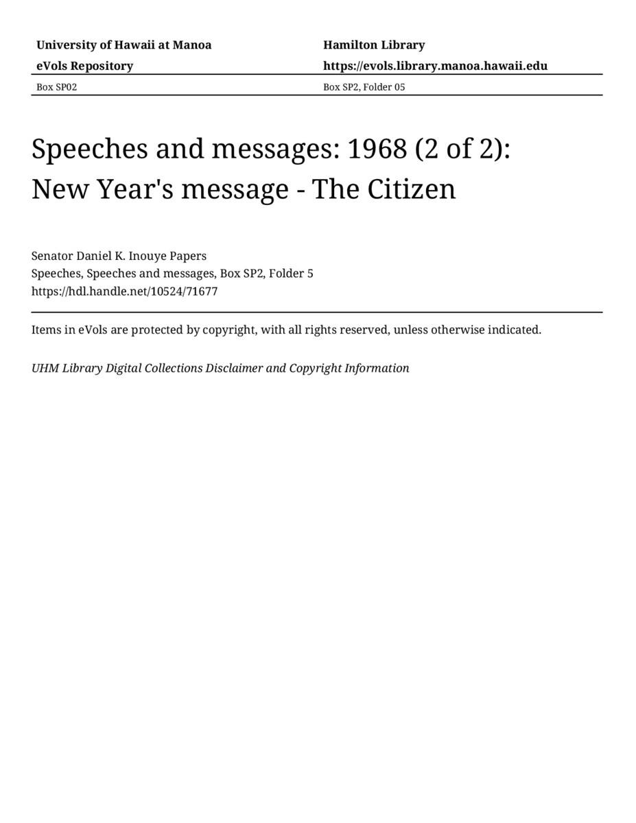 New Year's message - The Citizen, December 9, 1968, MANUSCRIPT-HCPC00011, Speeches, Speeches and messages, Box SP2, Folder 5, Senator Daniel K. Inouye Papers, Hawaiʻi Congressional Papers Collection, University of Hawaiʻi at Mānoa Library, Honolulu, HI. https://congressarchives.org/catalog/10524_71677 (accessed March 21, 2026).