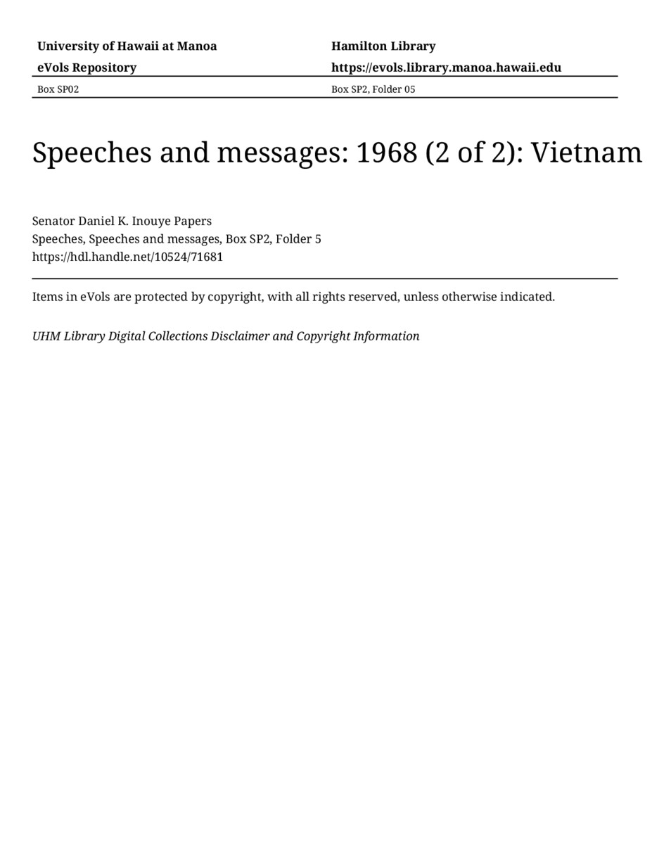 Vietnam, 1968, MANUSCRIPT-HCPC00011, Speeches, Speeches and messages, Box SP2, Folder 5, Senator Daniel K. Inouye Papers, Hawaiʻi Congressional Papers Collection, University of Hawaiʻi at Mānoa Library, Honolulu, HI. https://congressarchives.org/catalog/10524_71681 (accessed March 20, 2026).