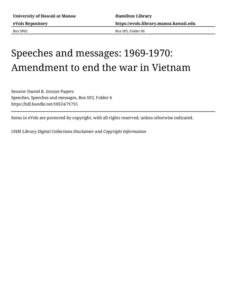 Amendment to end the war in Vietnam, 1969-1970, MANUSCRIPT-HCPC00011, Speeches, Speeches and messages, Box SP2, Folder 6, Senator Daniel K. Inouye Papers, Hawaiʻi Congressional Papers Collection, University of Hawaiʻi at Mānoa Library, Honolulu, HI. https://congressarchives.org/catalog/10524_71715 (accessed March 21, 2026).