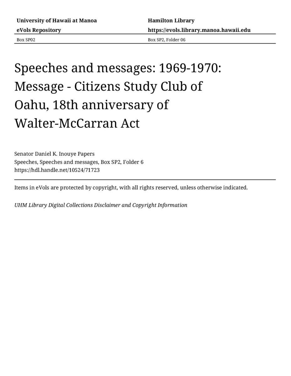 Message - Citizens Study Club of Oahu, 18th anniversary of Walter-McCarran Act