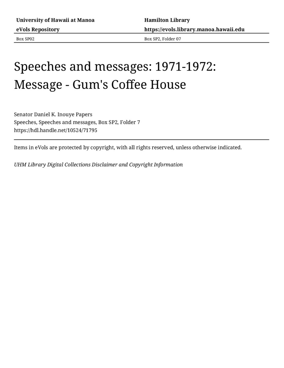 Message - Gum's Coffee House, November 10, 1971, MANUSCRIPT-HCPC00011, Speeches, Speeches and messages, Box SP2, Folder 7, Senator Daniel K. Inouye Papers, Hawaiʻi Congressional Papers Collection, University of Hawaiʻi at Mānoa Library, Honolulu, HI. https://congressarchives.org/catalog/10524_71795 (accessed March 16, 2026).
