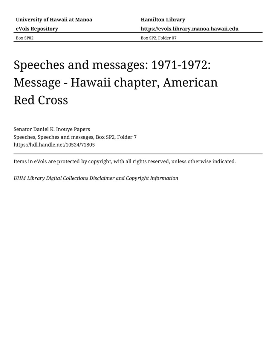 Message - Hawaii chapter, American Red Cross, June 21, 1971, MANUSCRIPT-HCPC00011, Speeches, Speeches and messages, Box SP2, Folder 7, Senator Daniel K. Inouye Papers, Hawaiʻi Congressional Papers Collection, University of Hawaiʻi at Mānoa Library, Honolulu, HI. https://congressarchives.org/catalog/10524_71805 (accessed March 22, 2026).