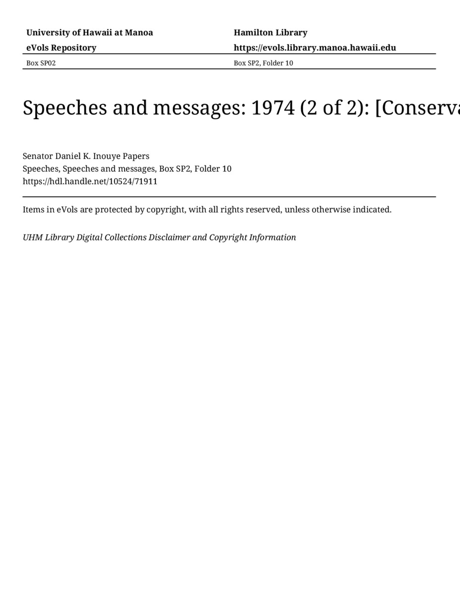 [Conservation], September 12, 1974, MANUSCRIPT-HCPC00011, Speeches, Speeches and messages, Box SP2, Folder 10, Senator Daniel K. Inouye Papers, Hawaiʻi Congressional Papers Collection, University of Hawaiʻi at Mānoa Library, Honolulu, HI. https://congressarchives.org/catalog/10524_71911 (accessed March 21, 2026).